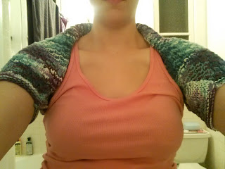 I wore this piece to church on Sunday and a couple folks asked if I'd made the shrug (which of course made my day). When I told them that I did, I mentioned that it's really easy because all you're doing is knitting a rectangle and then sewing it up. This is what I originally did; I knitted a rectangle and sewed it up at the edges like the pattern says. But the photograph on Lion Brand's website is misleading. (I'm also going to argue that their pictured shrug was blocked.) If you leave the sleeves sewn straight, you get a sort of winged effect. It did not look good. So, I ripped out the sewn edge and folded the corners over while modeling the shrug to make the sleeves as tight as I could.